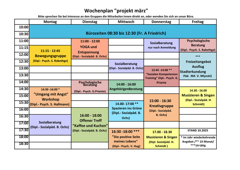unsere Gruppenangebote, die Ausflüge, der "Offene Treff" sowie Psychologische und Soziale Beratung sind für Sie da! Melden Sie sich gern über Ihren ASP-Bezugsbetreuer:innen oder für die Gruppen- bzw. Beratungsangebote direkt über 040-2997755 an.